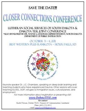 This joint conference, sponsored by Lutheran Social Services of South Dakota & Dakota TESL and Dr. Wayne G. Sanstead, Superintendent, North Dakota Department of Public Instruction, will be held October 3-4, 2011, at the Best Western Plus Ramkota in Sioux Falls, South Dakota. The keynote speaker, Dr. J.C. Chambers, will speak on deep brain learning and teaching students who have experienced trauma. Other sessions will cover teaching ELS/ESL, SIOP, refugee and immigration issues, cultural panels, and employment. For more information about registration or presenting visit www.DakotaTESL.com or contact Rachel Peterson, Dakota TESL treasurer and communications coordinator, at (605) 254-4813 or Raquel.rene83@gmail.com.
