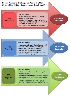2. Personality Types: Personalities are divided into classic types and classroom roles are suggested that make use of their characteristics. (The session handout includes a list.) Even students such as the nonparticipator or the inveterate translator, who are often hard to include in group work and may even be destructive to the group dynamic, can be given compatible tasks. (See Table 1 for more information from the session.)
