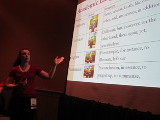 Kelli Meyer told about teaching academic language to high school English learners while they prepared for a special event at a college called the World Affairs Challenge. As her students researched food issues for their presentations at this event, Kelli developed lessons that led them to analyze the use of demonstrative adjectives and nominalizations in academic texts, and to use these forms productively as they prepared their speeches.