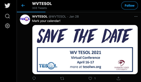 You can also find us on Twitter: https://twitter.com/WVTESOL