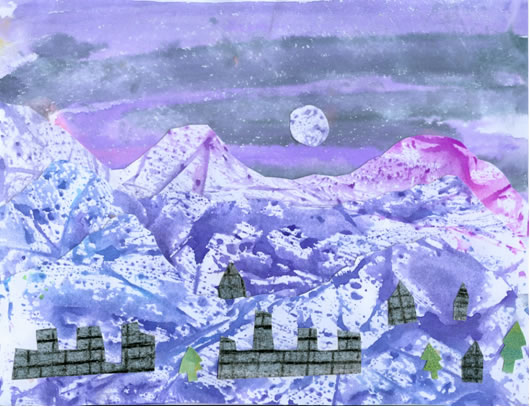 In Image-Making, language learners create collage images from hand-painted papers they create. After students have a portfolio of papers, they cut out shapes and glue them to a painted background as a collage to develop each page of their story.