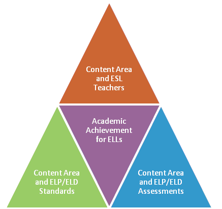 In order to provide effective professional development for those who teach ELLs, teacher educators must first have an understanding of the systematic role that content area and ESL teachers have in teaching ELLs. Within this framework, each of the three components (teachers, standards, and assessment) constantly interacts and influences each other as parts of an inseparable system. An optimal system triangulates these elements and develops them equally so that ELLs are able to learn content and language simultaneously. One component cannot be neglected, or the other two will not flourish. Figure 1 represents the multifaceted approach to teaching ELLs that triangulates the relationship between content standards, ELP standards, content assessments, and ELP assessments to support overall academic achievement for ELLs.