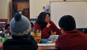When we meet for her interview, she is quiet at first, shy and apparently nervous. On this cold winter afternoon, she wears a heavy red cardigan buttoned over a black turtleneck: Like her personality, her attire is conservative but colorful, unassuming but bright. She starts to come out of her shell as soon as she begins to talk about her students.