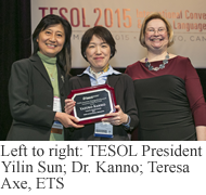 The title of Dr. Yasuko Kanno’s award-winning research, “‘I’m Not Going to Be, Like, for the AP’: English Language Learners’ Limited Access to Advanced College Preparatory Courses in High School,” almost has to be read aloud with a tinge of flair to be fully realized. And that’s exactly what Teresa Axe of ETS did at the 2015 TESOL International Convention & English Language Expo when she presented Kanno, a faculty member at Temple University, with the prestigious TESOL Award for Distinguished Research.