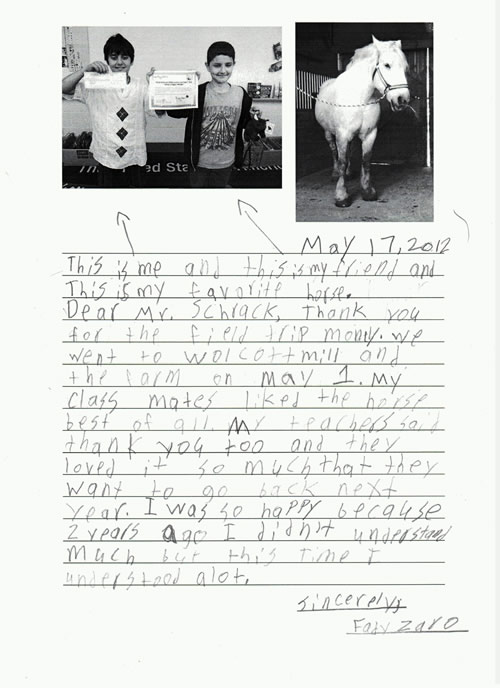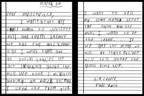 The photos below illustrate several of the grant-writing tips in this article. The letter (Figure 1) shows how even young ELLs can be involved in preparing a grant application. It also “tells a story” about an ELL student leading his classmates on the proposed field trip after having visited this farm before, as a newcomer. It indicates previous involvement, too, as it’s not proposing a completely new activity. The thank-you letter (Figure 2) from the student to the grant sponsors again shows youth involvement. This was included in the final report, and perhaps helped us successfully win another grant award from this same sponsor the following year!