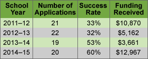 I’ve had many grant programs reject my applications, but accept my applications later. With experience, you’ll also learn which programs have higher rates of success and thus are worth your valuable time. Table 1 shows the number of applications I’ve written in the past 4 years and the success percentage rate. You can see that I’m submitting about the same number of applications every year, so I’m not working any harder, but I’m definitely getting smarter. You will, too, with practice!