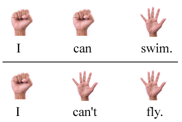 Like rubber bands, hand gestures can help students feel the seemingly irregular pace inherent to English speech rhythm. L2 learners often struggle to reduce the content words and highlight the focus words sufficiently. “It is common for students to emphasize every word when they are anxious to be understood. This gives the appearance of agitation or insistence that they may not intend, and it certainly diminishes the effectiveness of the prosodic ‘road signs’ that the listener needs” (Gilbert, 2008, p. 4). Therefore, it can be helpful to have students open and close their hands, as described in Grant (2010), while reading sentences. For instance, when we are reading sentences with can and can’t aloud, I often have students open their hands on the stressed words and make a fist on the unstressed words. (See Figure 1.)