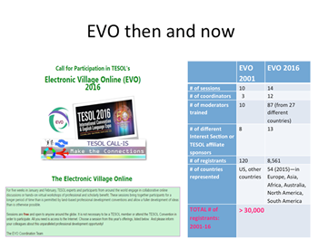 From the opening of the TESOL convention until the end, this room is buzzing with activity. Without attending a session, convention attendees with tech questions can stroll in and always find CALL-IS volunteers with ready answers and information on good training choices. The great networking culture of the EV goes back to 1986, when the EV was conceptualized as a hospitality room at the Anaheim TESOL convention. At the 1988 convention in Chicago, computers were added to the hospitality room. Soon after, software lists were shared with members who could try out new tools in a commercial-free environment. At the 1997 convention in Orlando, the term “hospitality room” was changed into the term “Electronic Village.” The EV has developed over the years into a meeting place for professionals to learn, share, and network. Here is a short snapshot of the history from a presentation by Christine Bauer-Ramazani at the 2016 TESOL convention: