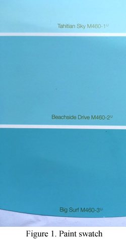 One game I created (inspired by the “smoke silver” comment) uses paint swatches. Students choose a swatch and then are asked to use two or three of the color names in a sentence (but not as a color). This asks them to think beyond the literal meaning of the word(s) and to be creative. Associating a color with a new word makes it more memorable. Students then vote on whose sentence is the cleverest. For example, one student wrote (using the three colors from the swatch in Figure 1): “The Big Surf that flooded Beachside Drive reflected a Tahitian Sky.”