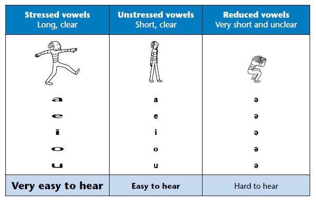 Schwa is a sort of “ghost vowel.” This is a key stumbling block for learners because it doesn’t appear in the written language, and also because it is hard to notice. But schwa is the most common vowel sound in spoken English. This is why English rhythm is irregular; the peak vowel is extra long and most of the other vowels are extra short.
