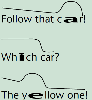 English calls attention to the focus words by three basic signals: extra clarity, extra length, and a marked pitch change. Focus words convey new information (what hasn’t already been talked about). See Figure 4 for an example of the focus changing as a conversation continues. It is crucial that learners are able to hear/process those signals.