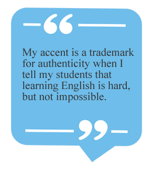 On March 21, 2001, I finally stood in front of students. Since then, I am aware of my nonnative status, and I made sure when I interviewed for my current position that I immediately tackled the elephant in the room: my accent. My principal, Kevin Carroll, and the department leader, Melanie Reeves, didn’t even understand what I was addressing: They saw me and not my accent. However, in the classroom, my accent is clearly an advantage. From my high schoolers to my graduate students, my accent is a trademark for authenticity when I tell my students that learning English is hard, but not impossible.