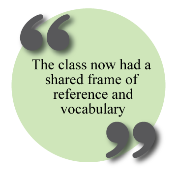 During these interactions, I noticed several communication strategies in use. For example, one pair of students was using language switching back and forth between English and Spanish as they discussed the painting, showing they understood the general concepts being discussed even if they did not have all of the English vocabulary necessary to discuss it yet. Another student with more English experience was then able to give them the vocabulary they needed (an appeal to authority) to share their ideas with the class. After having time to think about the painting individually and discuss it in small groups before sharing their ideas with the entire class, students were more confident about sharing their ideas. More important, the class now had a shared frame of reference and vocabulary that we could refer back to when reading the trial scenes in the play. (Brown, 1994)
