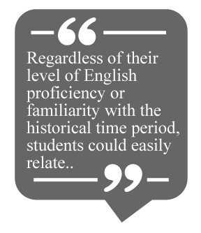 Regardless of their level of English proficiency or familiarity with the historical time period, students could easily relate to the emotional faces of the people depicted and the physical action of the scene. Then, with their partners, they were able to practice spoken language as they discussed what they noticed.