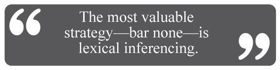 The most valuable strategy—bar none—is lexical inferencing. This refers to the ability to look around and inside of words in order to guess their meaning. By developing this skill, students build reading fluency and vocabulary retention.