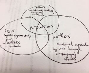 The end product of each student will vary. One may use a picture with a caption to illustrate each of the three components of persuasion. Another may include main ideas of each component in one of three simple circles. Students may also use a pie chart divided into three sections presenting each of the three components of persuasion they have read in the passage, briefly describing important information regarding each component of persuasion inside each section within the chart. The ways of presenting the information can be as varied as your number of students. See an example in Figure 1.