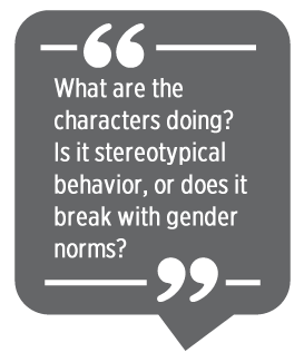 A second simple way to analyze your reading materials for bias is to examine drawings and photographs that accompany them. There are several things to look for when doing this. First, it’s a good idea to count again. Are there more drawings of males, females, or neutral characters within a unit or extended reading? Then, consider whether characters are drawn to display their gender, such as with clothing, coloring, or body language. Is it necessary to have the gender of the character drawn in that reading? Next, consider the types of activities characters are doing in the images. This is a good time to notice who is passive as well. What are the characters doing? Is it stereotypical behavior, or does it break with gender norms?