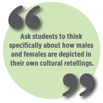 After students analyze a text such as a fairy tale, biography, nonfiction piece, or folktale, ask them to share a similar story, person of interest, or event from their own culture. This can be done as a think-pair-share or drawing activity in lower levels, or as a composition or presentation activity with more advanced learners. Ask students to think specifically about how males and females are depicted in their own cultural retellings. Whose perspectives, thoughts, and feelings are given in that version? Whose perspectives are missing? How does this differ from the one you read in class?