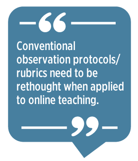 A number of criteria on conventional observation protocols/rubrics need to be rethought when applied to online teaching. Most obviously, a question like “How does the instructor support the lesson with technology?” is problematic when the entire class is online. We have found that many instructors are given specific platforms (LMS, e-text) to teach with. Is the teacher expected to go beyond the activities built into these packages and use outside apps?