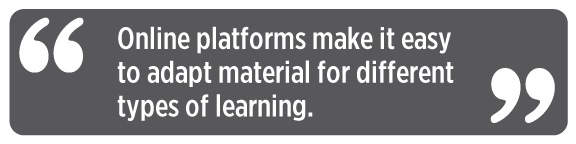 Online platforms make it easy to adapt material for different types of learning. Enabling the chat function of Zoom allows students to type their responses; this lets students participate who would otherwise be silent in a physical classroom. Recording the class and making the video accessible to students afterwards helps those who need to listen to instructions or information more than once. Students are able to share pictures, graphics, and other visual aids more easily and can be provided with a wide range of resources to support their learning.
