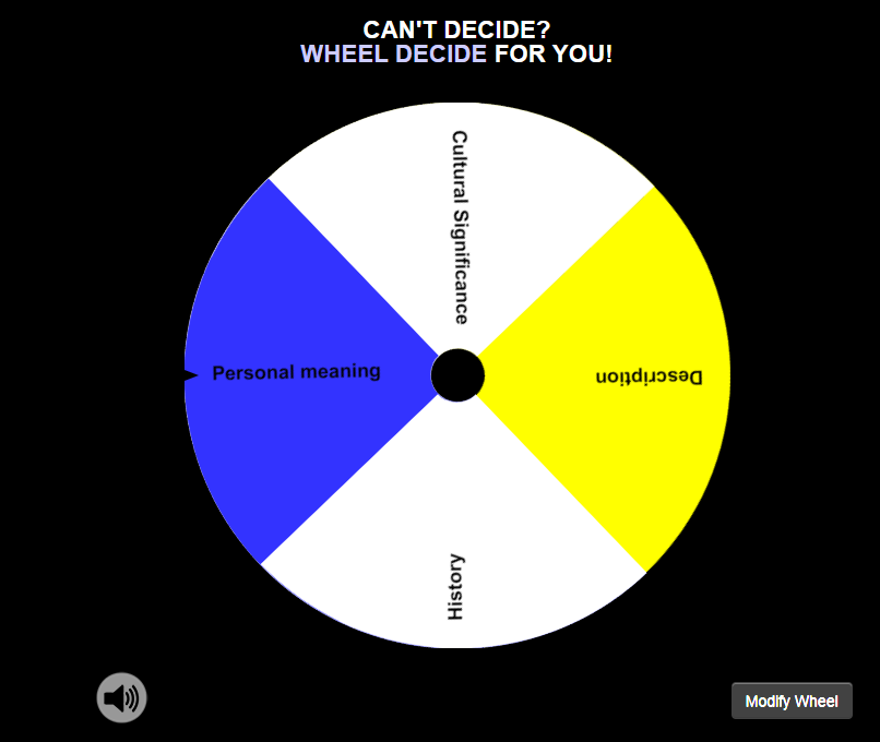 Spin the online wheel (see Figure 1), which is projected on a monitor/screen for all students to see; then have a student read the category it lands on.