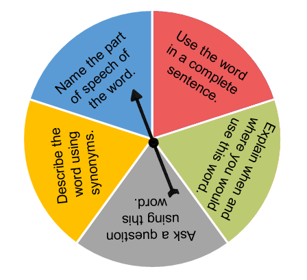 Using the vocabulary list, students will take a vocabulary word and complete the command indicated on the wheel once the arrow stops spinning. If the arrow falls in the middle of a command, the students are to follow the command on the right.
