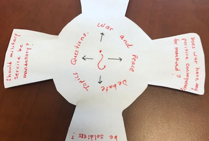 This wheel game is created to fit the content of a humanities course. Its purpose is to explore complex questions. The wheel used in this example (Figure 3) featured questions on war and peace: