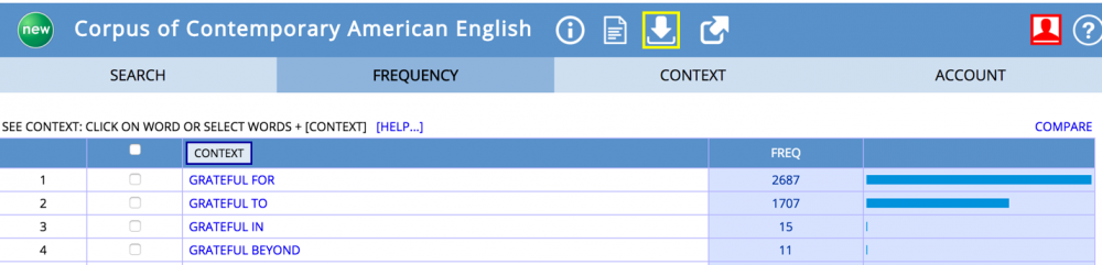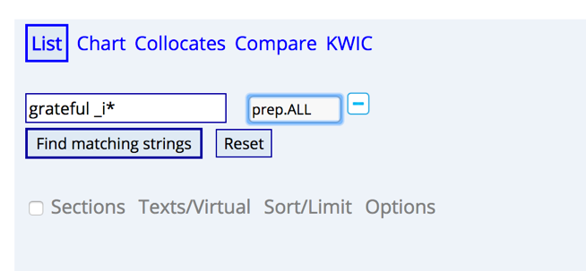 Figure 3. COCA search for grateful followed by a preposition. (Davies,