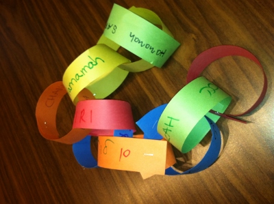 A buzz goes up as we connect the name strips to form a chain. The rebbetzin, a long-time teacher in Israel before