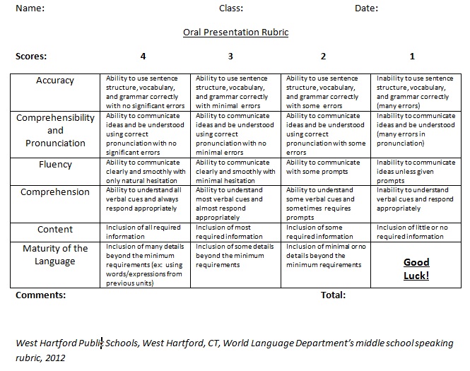 that they would become familiar with the sound of their voices. I used an oral language rubric that was created by the West Hartford Public School, West Hartford, CT, World Language Department's middle school, to score their reading. I then downloaded their pieces to each student's file on the computer.